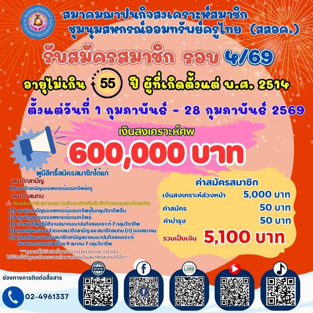 สมาคมฌาปนกิจสงเคราะห์สมาชิกชุมนุมสหกรณ์ออมทรัพย์ครูไทย(สสอค.) เปิดรับสมัครสมาชิก รอบ 4/2569