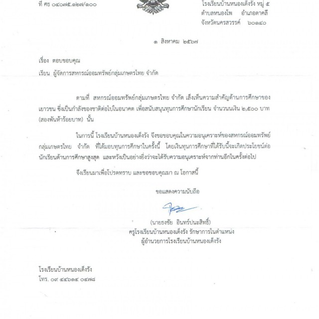 มอบทุนสาธารณะประโยชน์ให้กับโรงเรียนบ้านหนองเต็งรัง