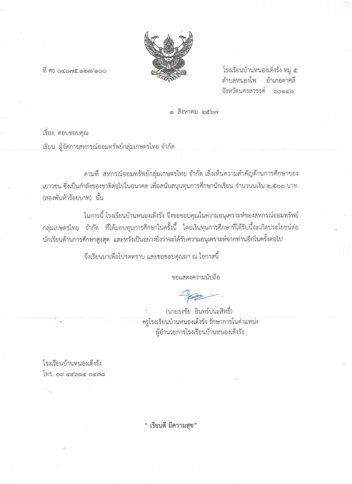 dasdasdsa วันที่ 1 ส.ค.67 นายวิรัตน์ อ่อนนิ่ม ประธานกรรมการ นายอลงกร จินดาทิพย์ รองประธานกรรมการ คนที่ 2 และนายไวพจน์ มีรักษ์ ผู้จัดการ ได้ร่วมกันมอบทุนสาธารณะประโยชน์ ให้กับโรงเรียนบ้านหนองเต็งรัง จำนวน 2,500 บาท เพื่อเป็นทุนการศึกษาสำหรับนักเรียน ขอให้บุญกุศล จึงตกแก่สมาชิกสหกรณ์ทุกท่านเทอญ