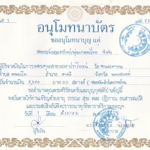 dasdasdsa วันที่ 1 ส.ค.67 นายวิรัตน์ อ่อนนิ่ม ประธานกรรมการ และ นายอลงกร จินดาทิพย์ รองประธานกรรมการ คนที่ 2 ได้มอบทุนสาธารณะประโยชน์ ให้กับวัดหนองตาราม เป็นเงิน 2,500 บาท โดยมีผู้ใหญ่มงคล มากบุญ ผู้ใหญ่บ้านหมู่ที่ 4 ต.หนองโพ อ.ตาคลี จ.นครสวรรค์ เป็นตัวแทนรับมอบ ขอบุญกุศลจงตกแก่สมาชิกสหกรณ์ทุกท่านด้วยเทอญ
