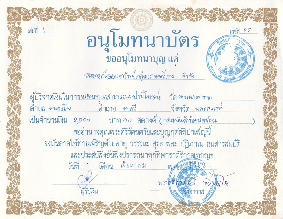 มอบทุนสาธารณะประโยชน์ให้กับวัดหนองตาราม
