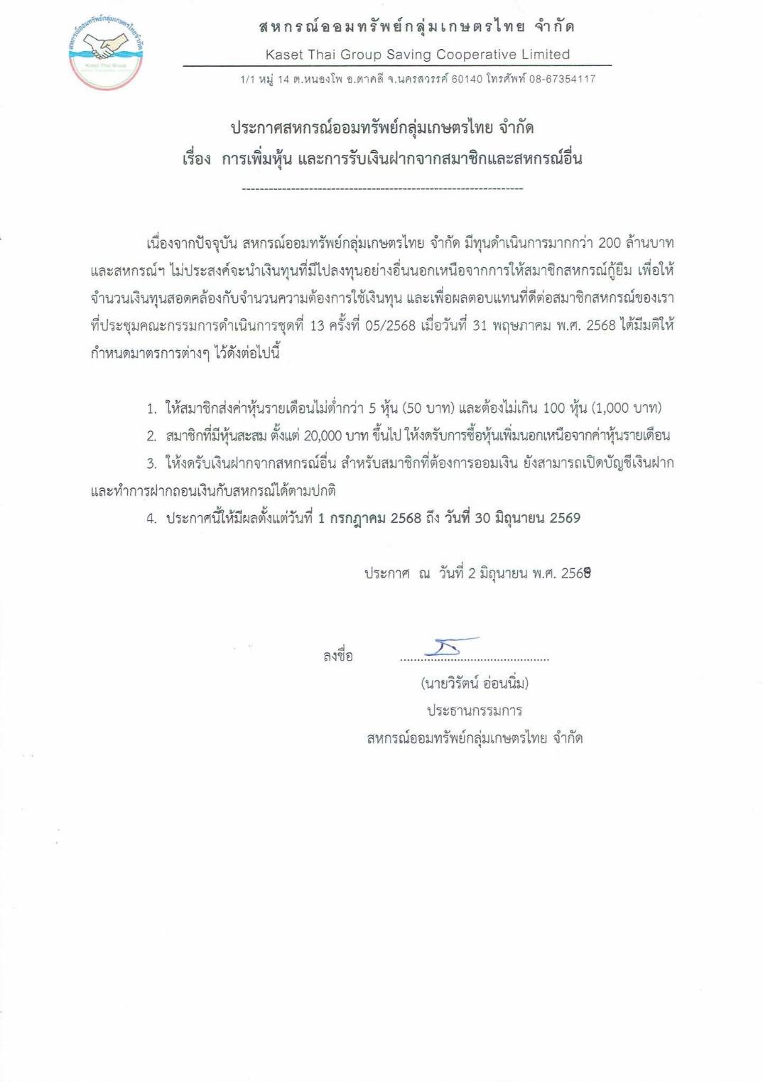 ประกาศสหกรณ์ออมทรัพย์กลุ่มเกษตรไทย จำกัด เรื่อง "การเพิ่มหุ้น และการรับฝากจากสมาชิกและสหกรณ์อื่น"